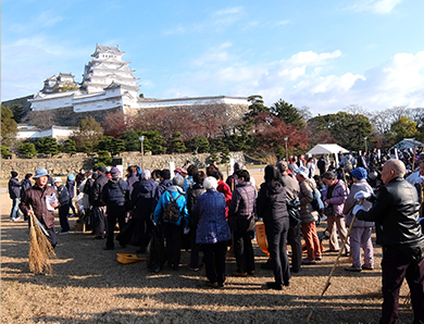 | 12月 姫路城清掃奉仕 | 市内小・中・高生、各種団体で構成された姫路城愛城会のメンバーの方々と共同で姫路城の清掃奉仕を続けています。 |